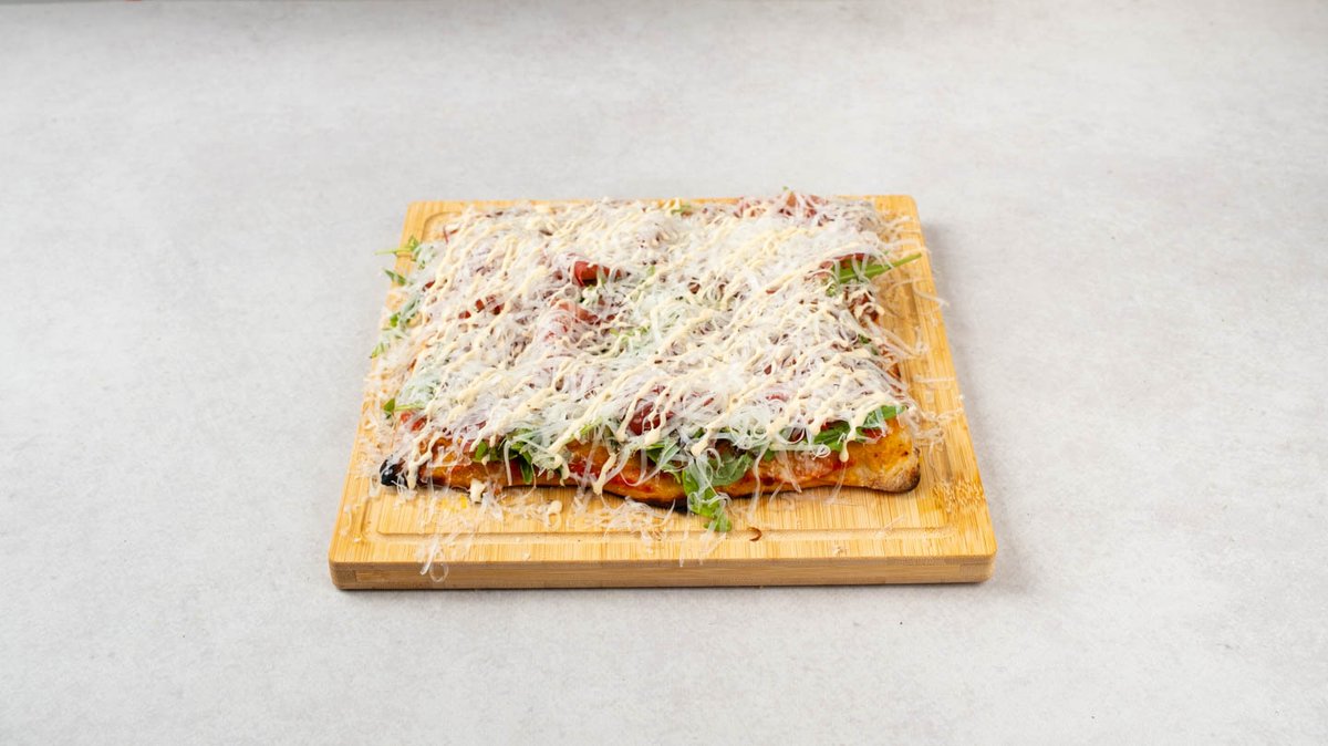 Umak od rajčice, mozzarella, kozji sir, bresaola, rikula i pecorino krema. Savršeno promišljena harmonija slanog I hrskavog sa daškom svježine. Veličina pizze je mala (190 gr)