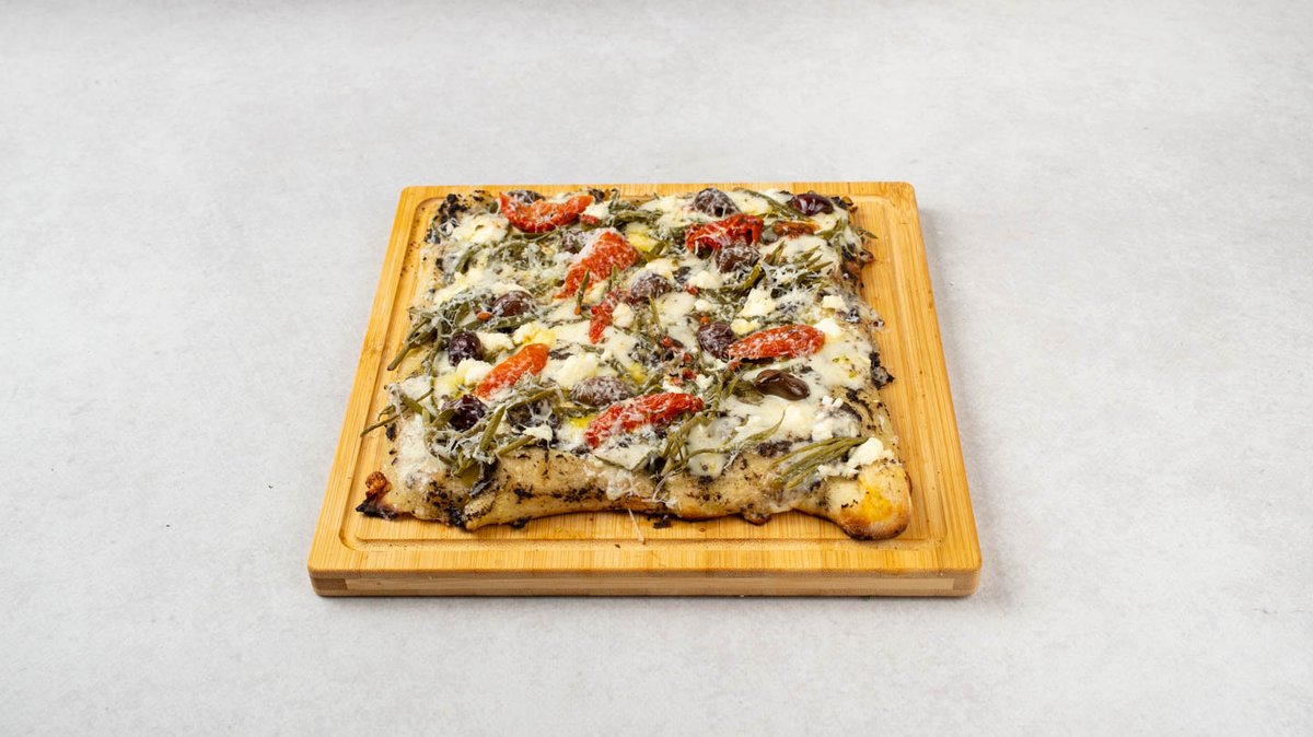 Krema od maslina, mozzarella, feta sir, kozji sir, polusušene rajčice, masline i motar. Mediteranski biser - umami okus koji mami na još! Veličina pizze je mala (190 g)