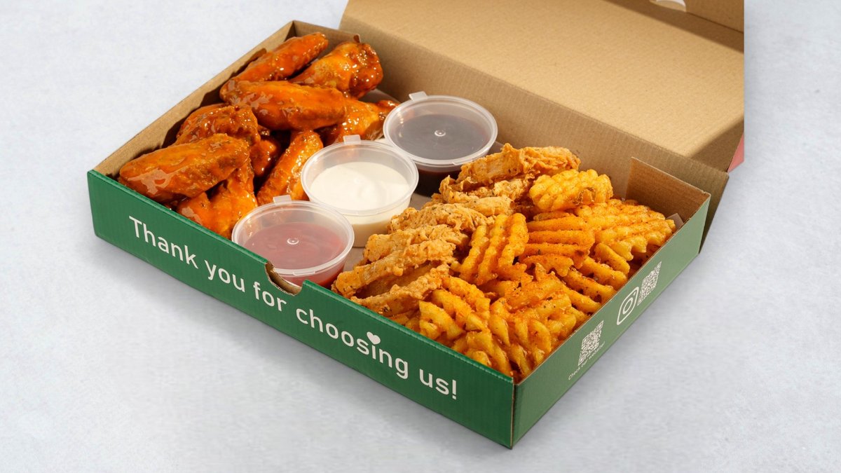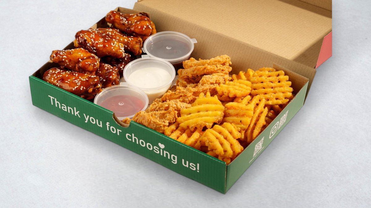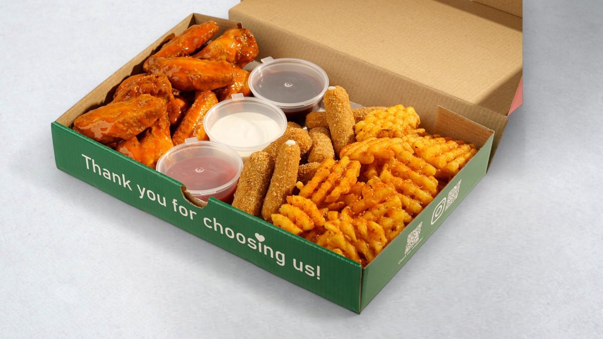 Pileća krilca, štapići od mozzarelle, vafl krumpirići, Buffalo umak, BBQ umak, Ranch umak, ketchup (1122g)