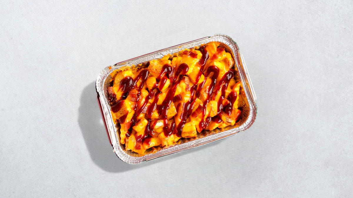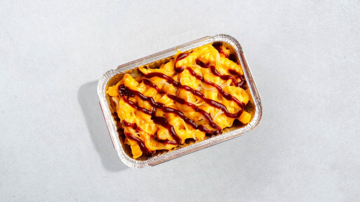 Pommes frites, cheddar sir, BBQ umak, kolutići prženog luka (626g)