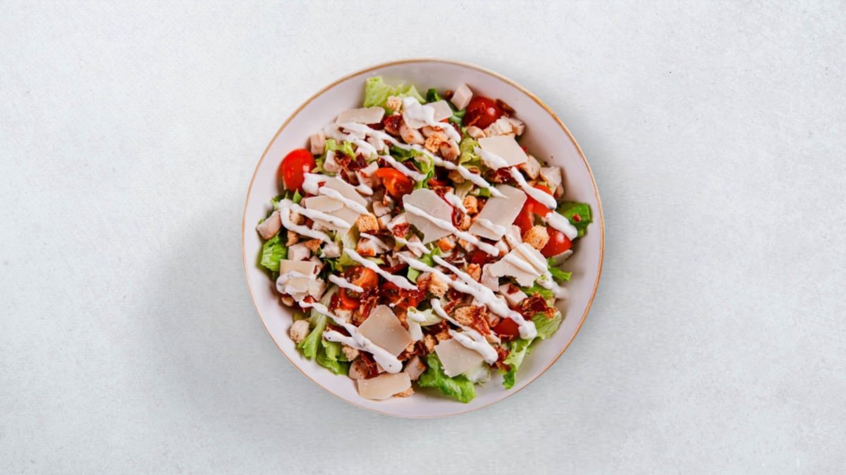 zelena salata,piletina,krutoni,rajčica,parmezan,pržena panceta,umak