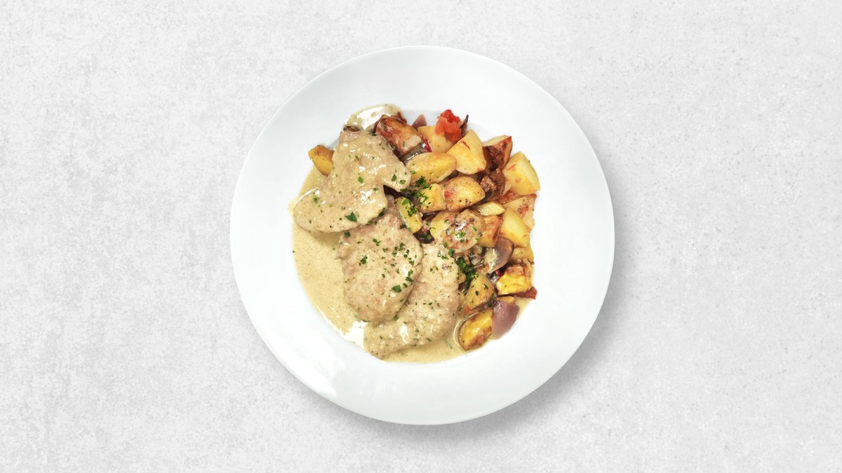 Svinjeći naravni s pečenim aromatiziranim krumpirom,umak od pečenja sa peršinom i češnjakom