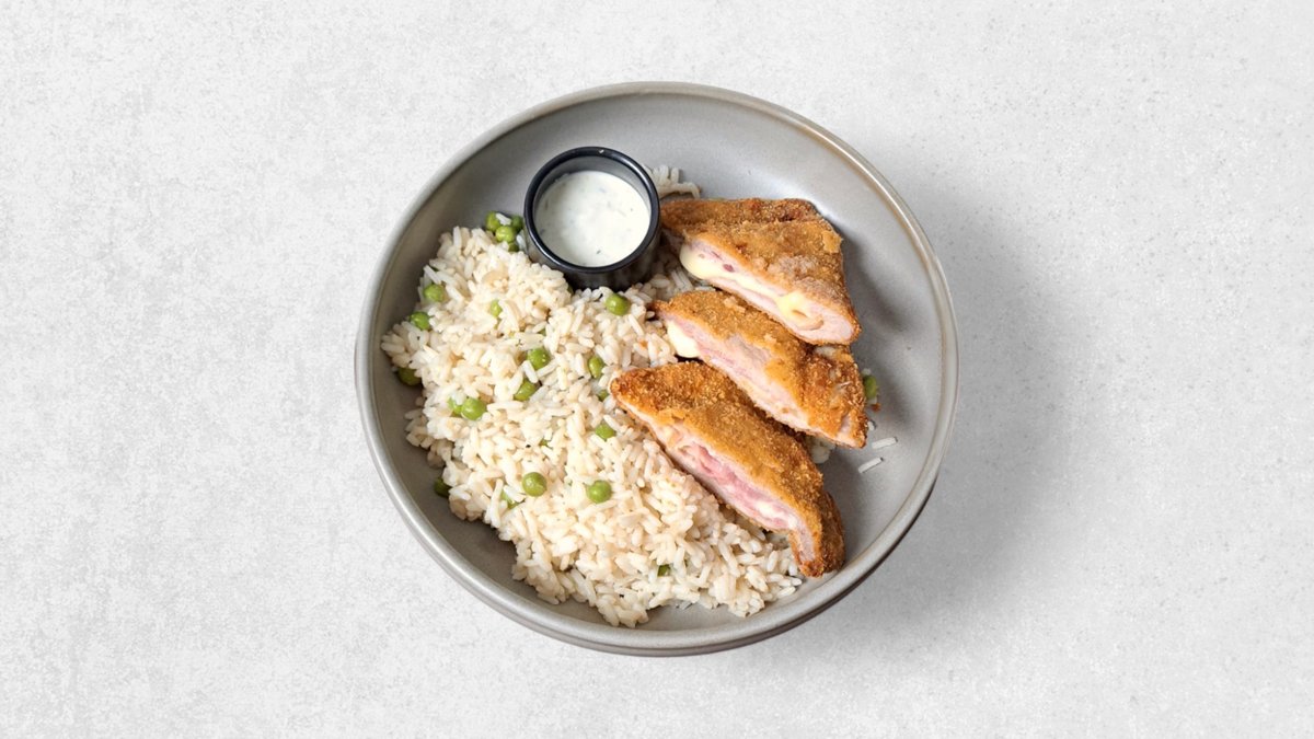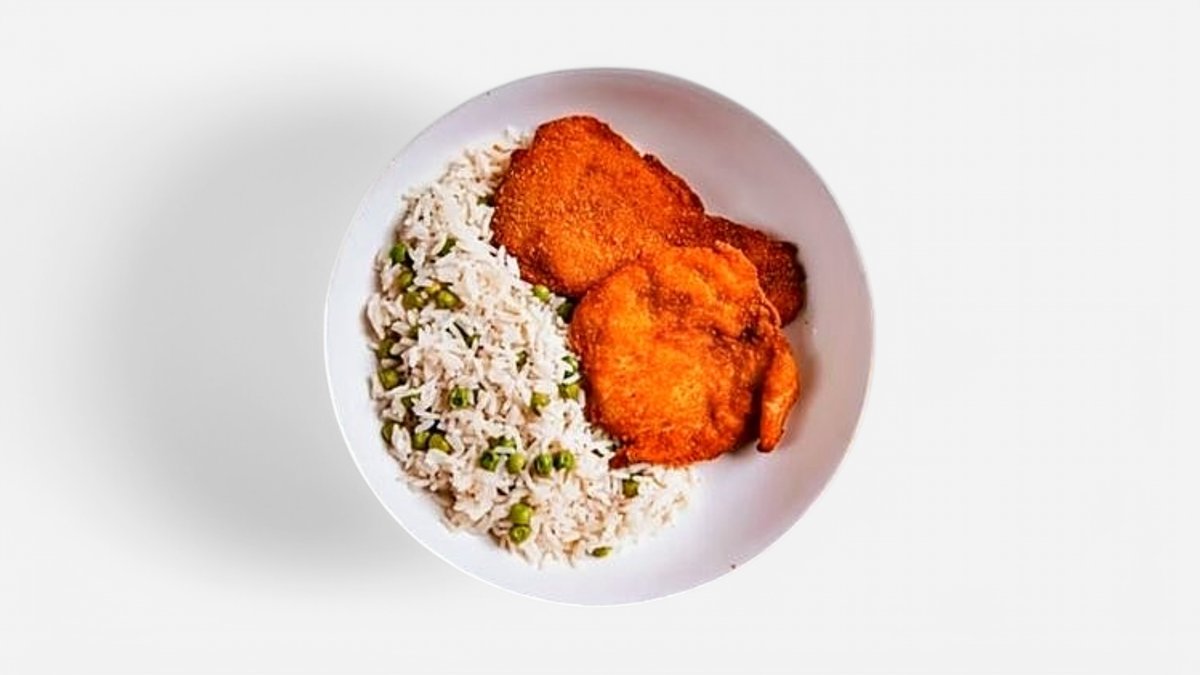 Pohana piletina prsa 3kom (200g), riža,grašak, tartar umak