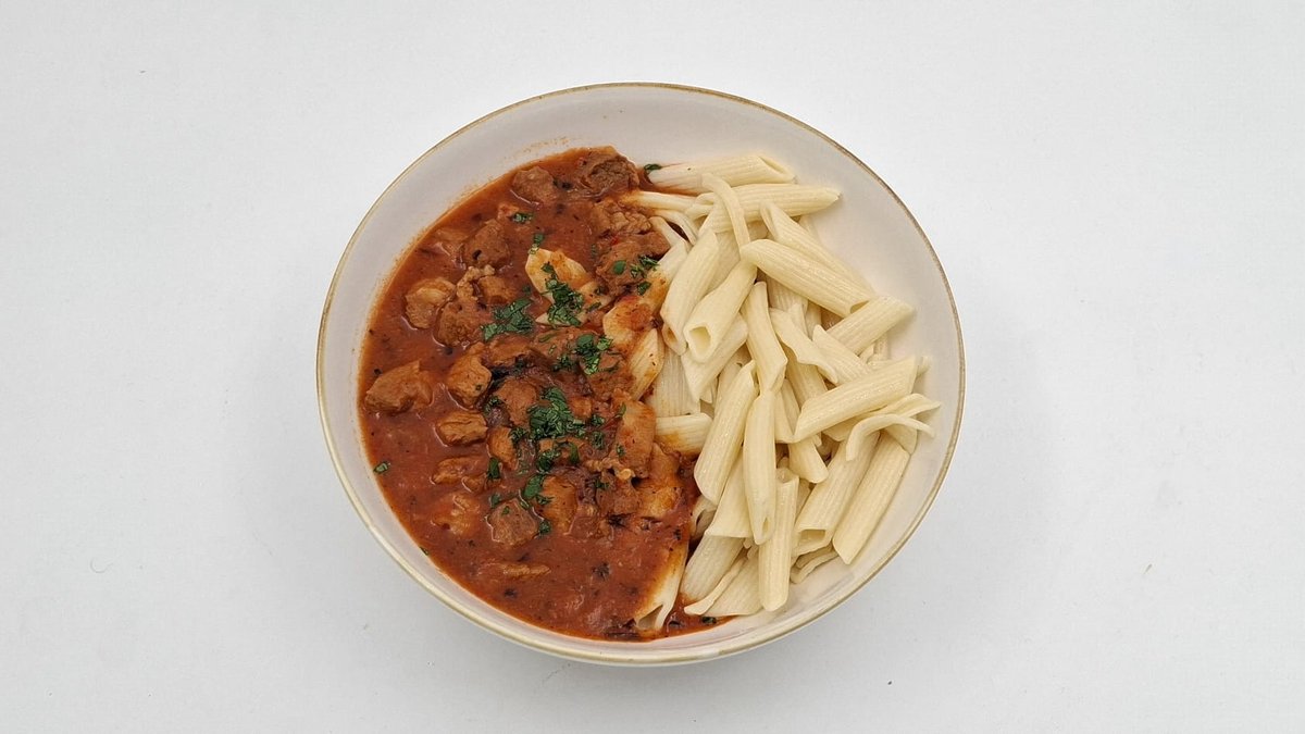 svinjetina,paprika,tjestenina,dvije šnite kruha