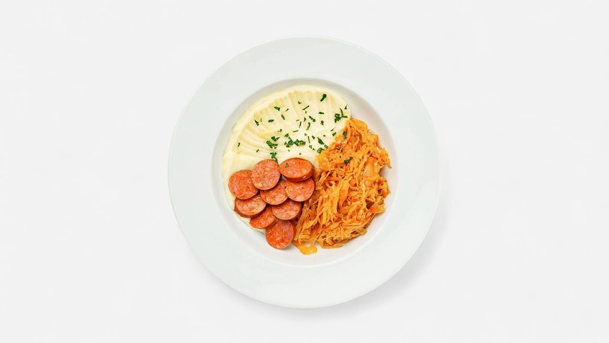 Domaća kobasica s kiselim dinstanim zeljem i krumpir pireom