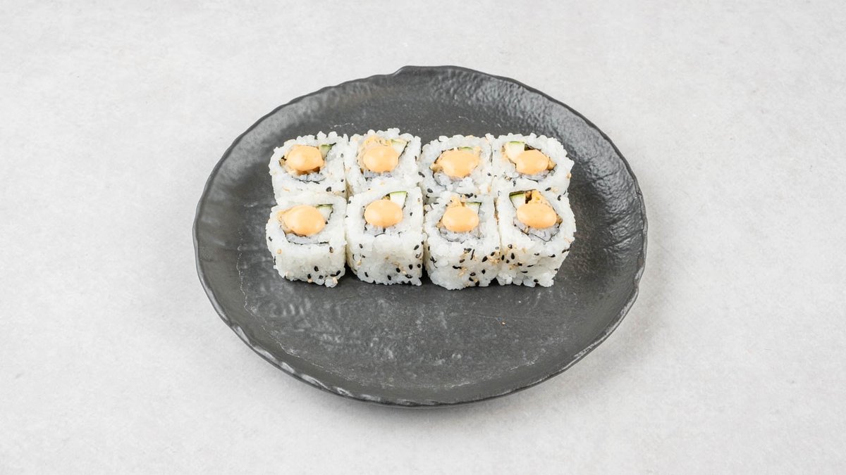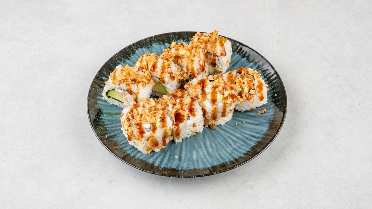 Losos u spicy majonezi, krastavac, mladi luk, tempura mrvice, 8 komada