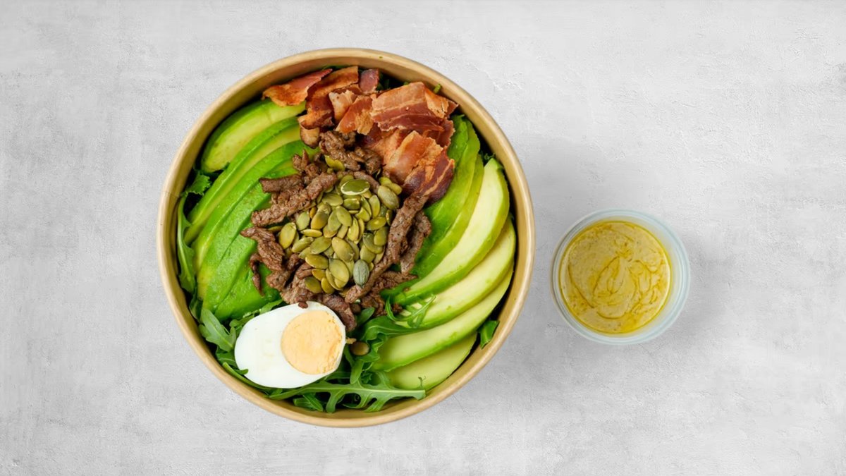 579 kcal + Keto Umak 110.5 kcal *Nutritivne vrijednosti u tablici odnose se na salatu bez uračunatog umaka. Ramsteak, jaje, hrskava panceta, iceberg salata, rikola, kovrčavi kelj, avokado, krastavac, bučine sjemenke + Keto umak (kiselo vrhnje, maslinovo ulje, senf, limun, sol, papar)