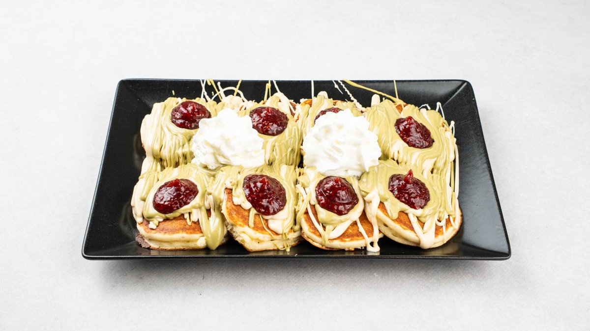 Mini američke palačinke, Lino Lada bijela, krema od pistacija, namaz od maline
