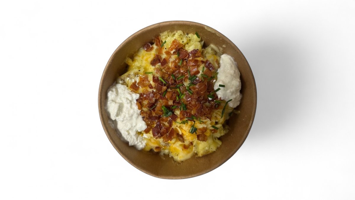 Klasik: hrskava slanina, topljeni cheddar sir i kiselkasti sour cream umak preko mekanog pečenog krumpira, posipano vlascem *slika je simbolična