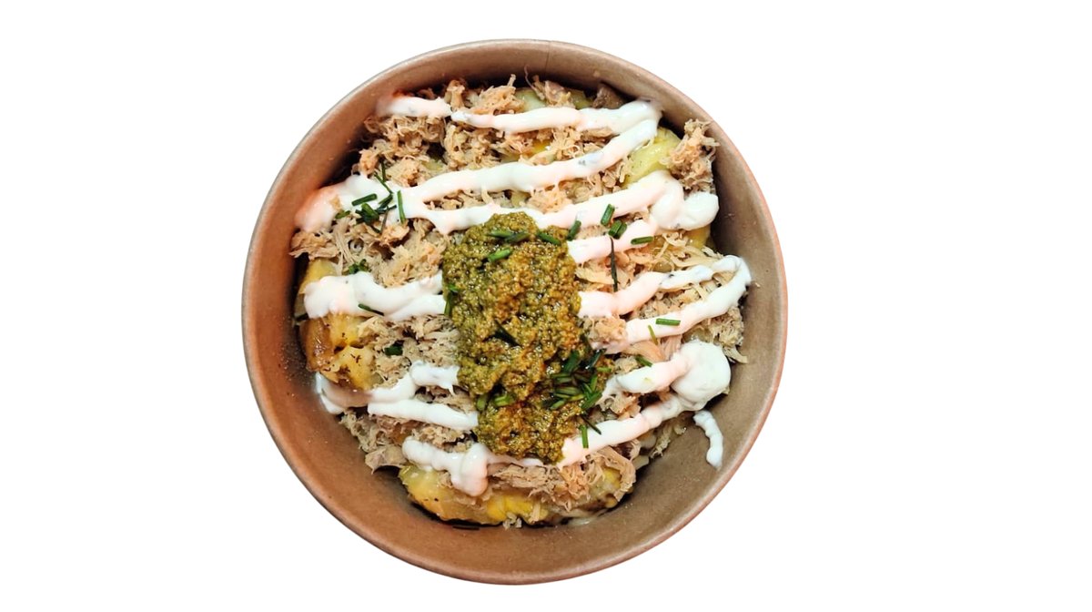 Pečeni krumpir, mješavina cheddar sireva, trgana piletina, pesto umak *slika je simbolična