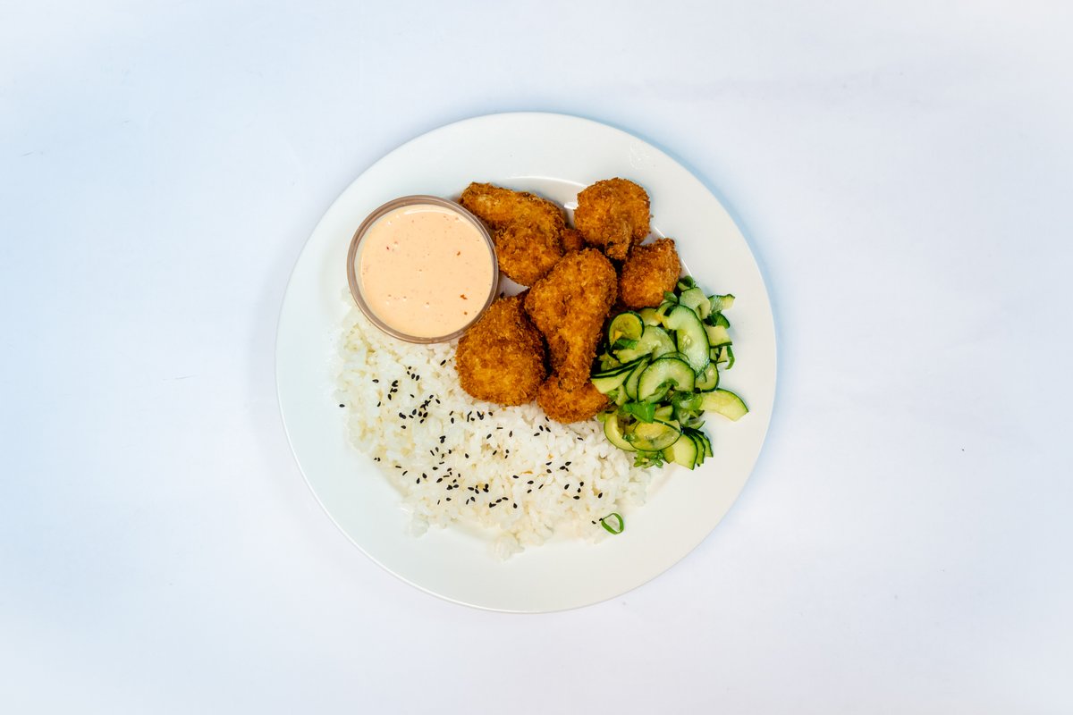 Piletina, panko mrvice, jasmin riža, slatko ljuti umak, sezam, mladi luk *slika je simbolična