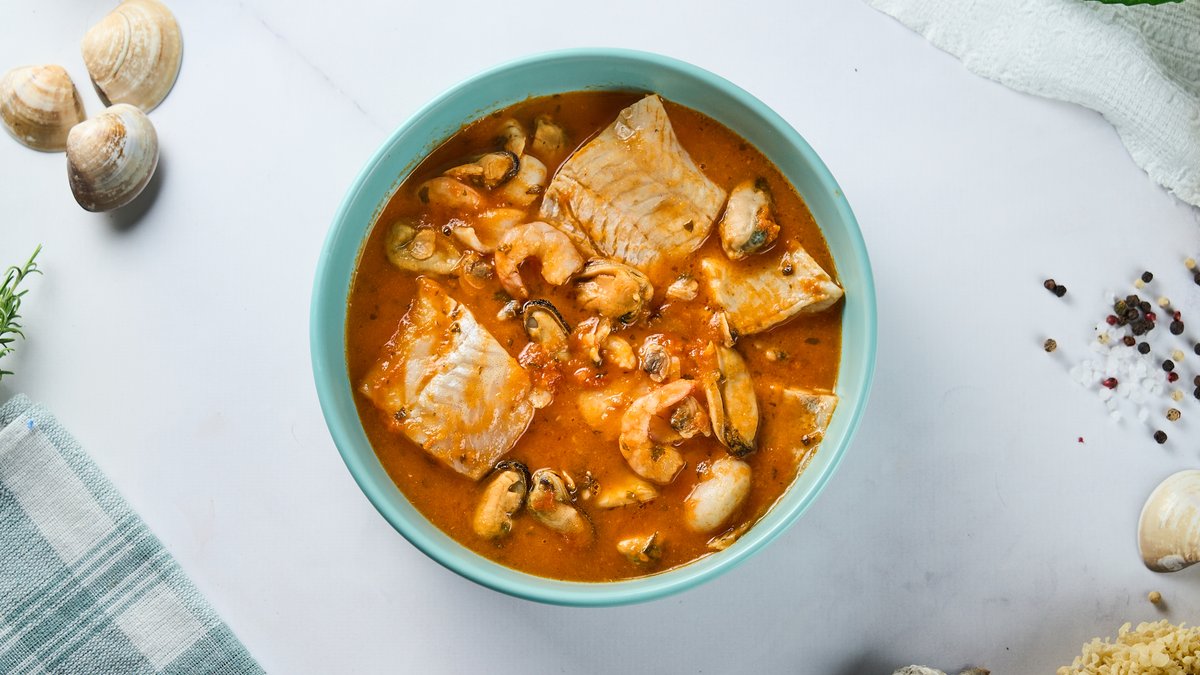 Kozice, oslić i sipa u umaku od rajčica, luka i bijelog vina