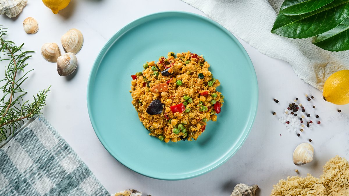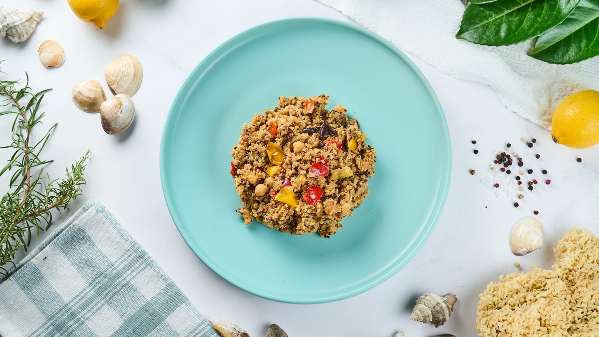 Quinoa bijela, crvena i crna sa slanutkom, paprikom i patlidžanima u umaku od badema, crnih maslina i suhih rajčica