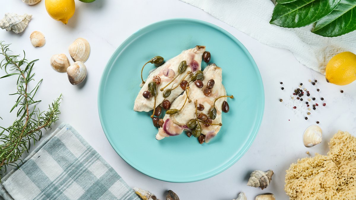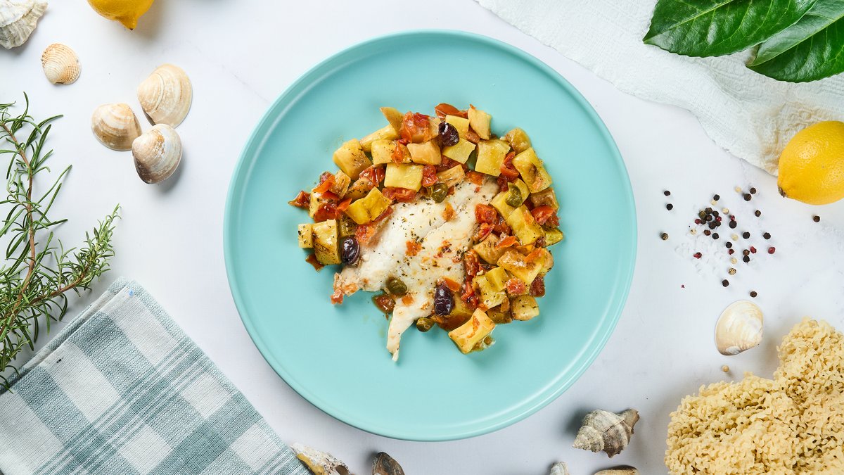 File orade s krumpirom, rajčicom, maslinama i kaparima u umaku od limuna i timjana