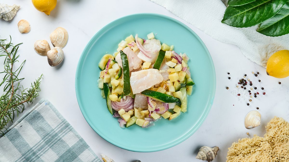 File oslića s krumpirom, tikvicama sa žara i malo slatkog crvenog luka