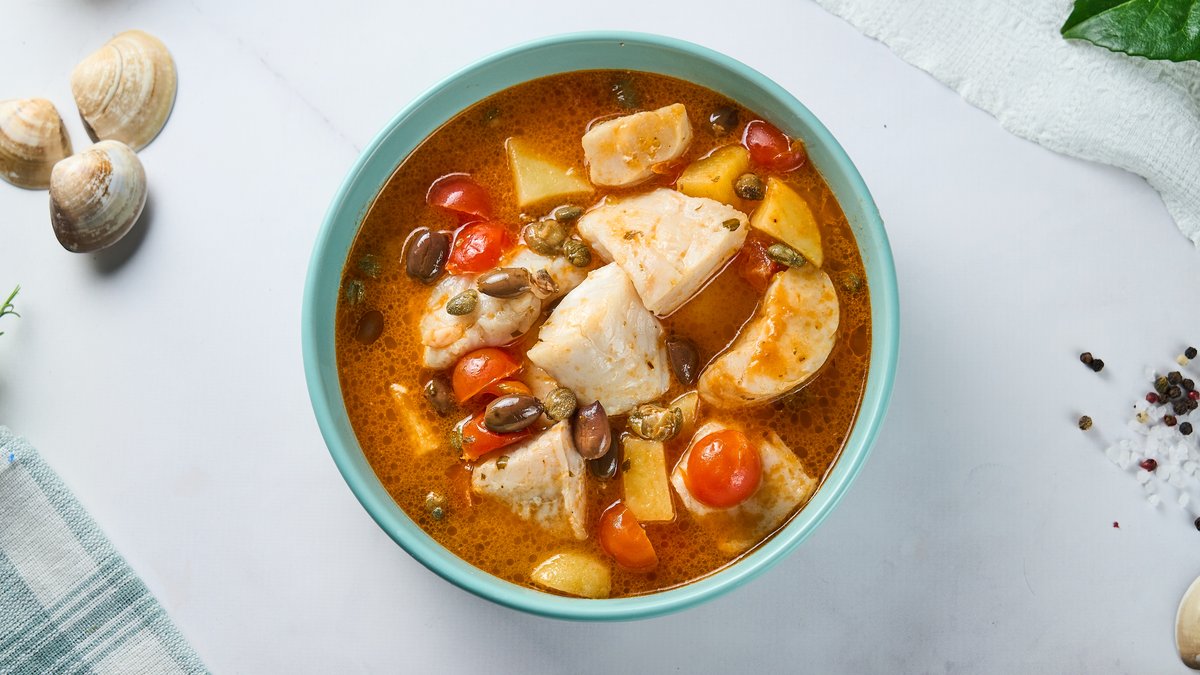 File oslića s krumpirom u umaku od rajčica, maslina i kapara