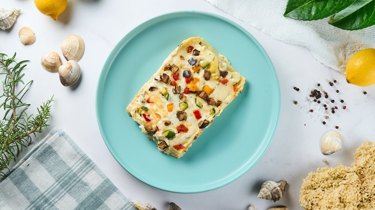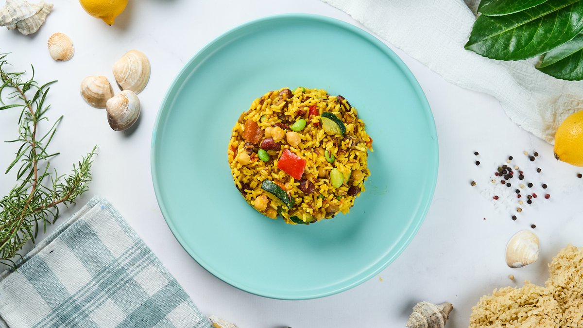 Long rain i crvena riža s tikvicama i patlidžanima sa žara, rajčicom, paprikom, ljubičastim lukom di Troppea, slanutkom, crvenim grahom i mahunama soje