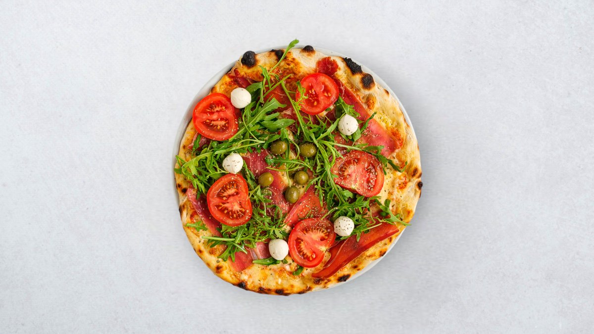 Umak od rajčice, mozzarella, pršut, rikula, grana padano, masline, cherry rajčice