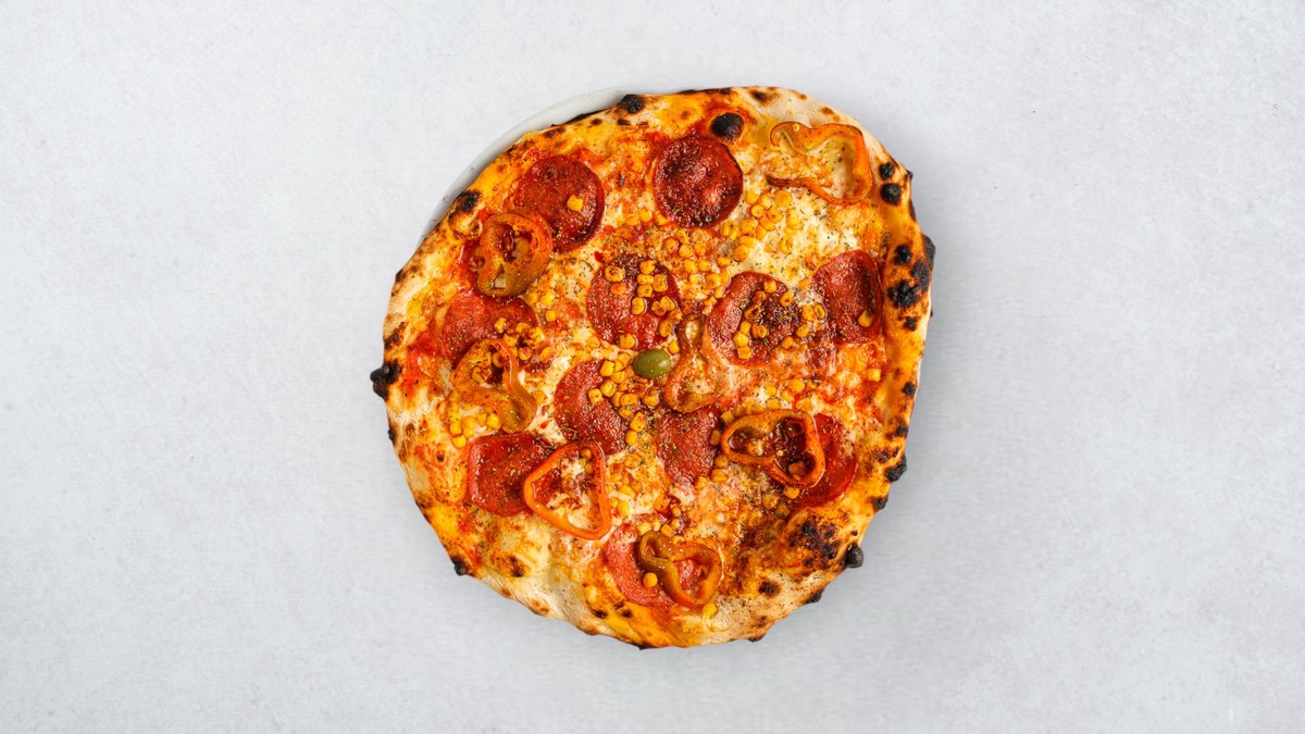 Tijesto, umak od rajčice, sir, kulen, kukuruz, paprika, chilli peperoncino Napolitana stil, 30% manje mase, isti volumen — lagana i prozračna