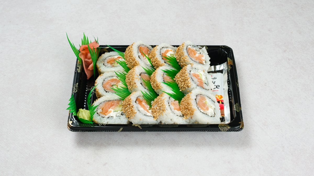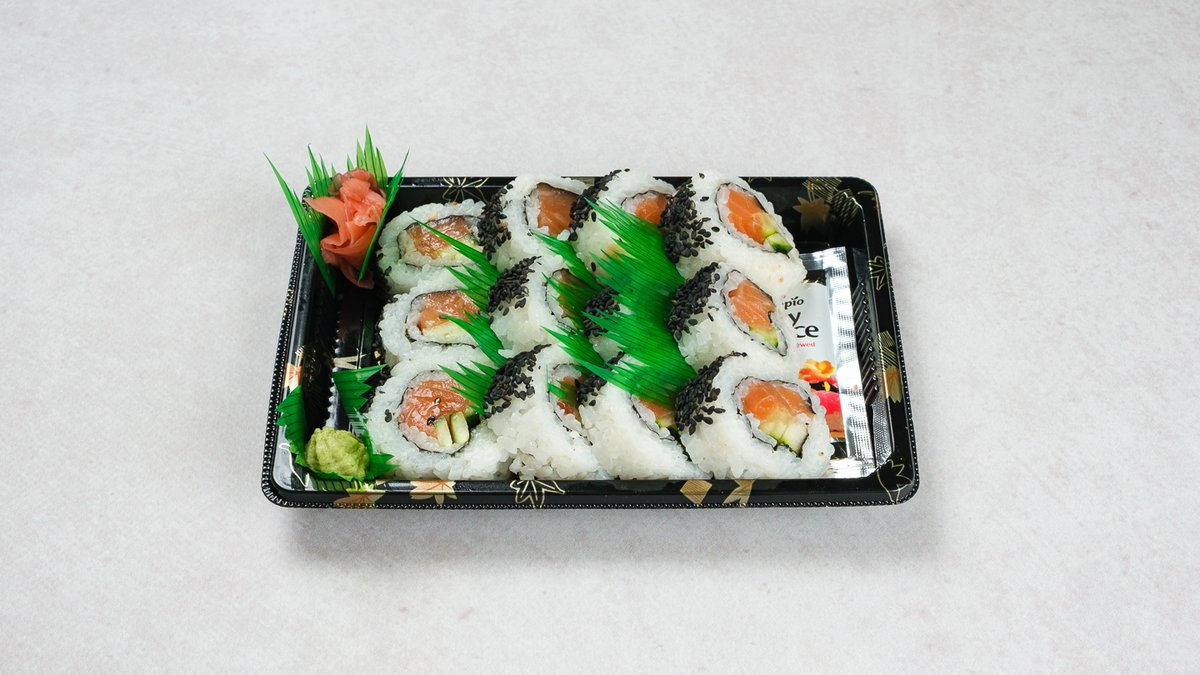 Uramaki: 12x dimljeni losos Sastojci: riža, alga, krastavac, dimljeni losos, krem sir, wasabi (gorušica), đumbir, sezam