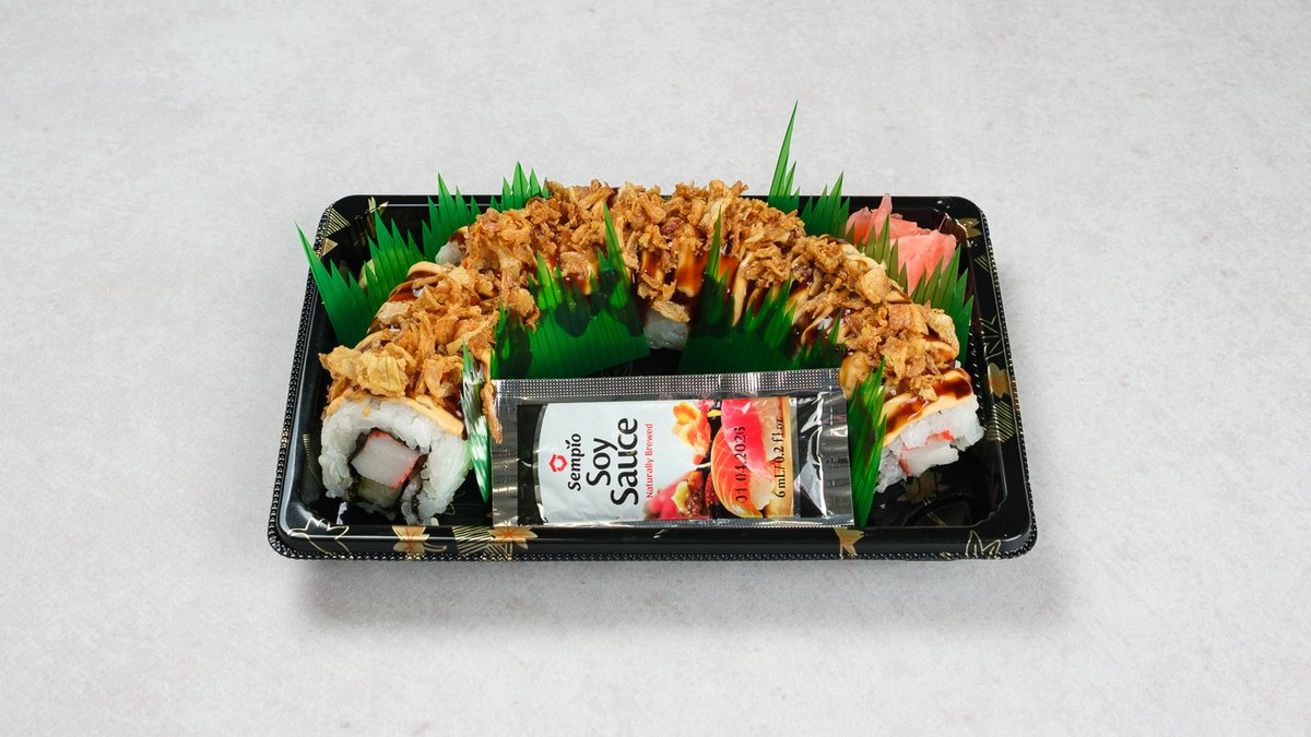 Uramaki: 12x surimi Sastojci: riža, alga, krastavac, surimi, prženi luk, pikantni umak od majoneze, Unagi umak, wasabi (gorušica), đumbir