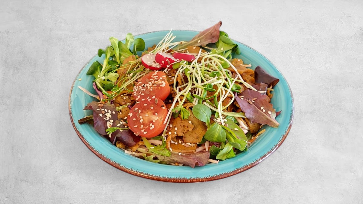 Marinirani grilani Seitan na zelenoj salati uz dodatak sezonskog povrća, klice ili izdanci, umak za salatu *vegan