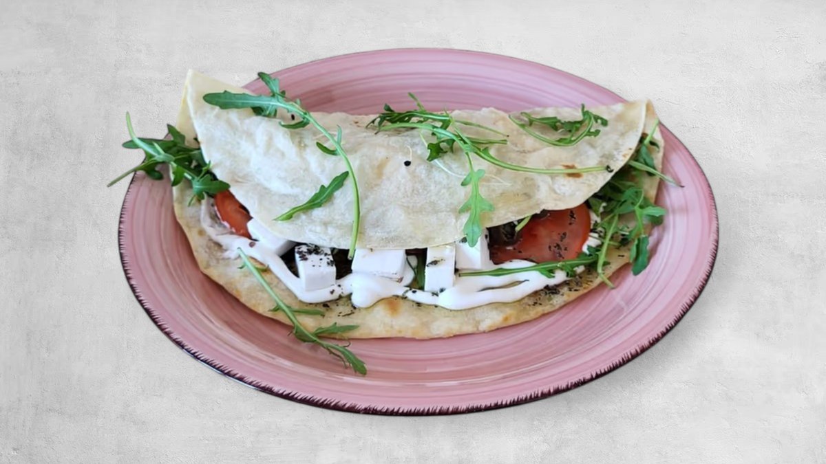 Veganski feta sir, rajčice, masline, rikola, maslinovo ulje sa mediteranskim začinima u tortilji *vegan * slika je simbolična