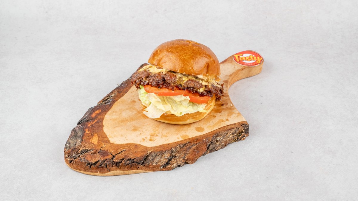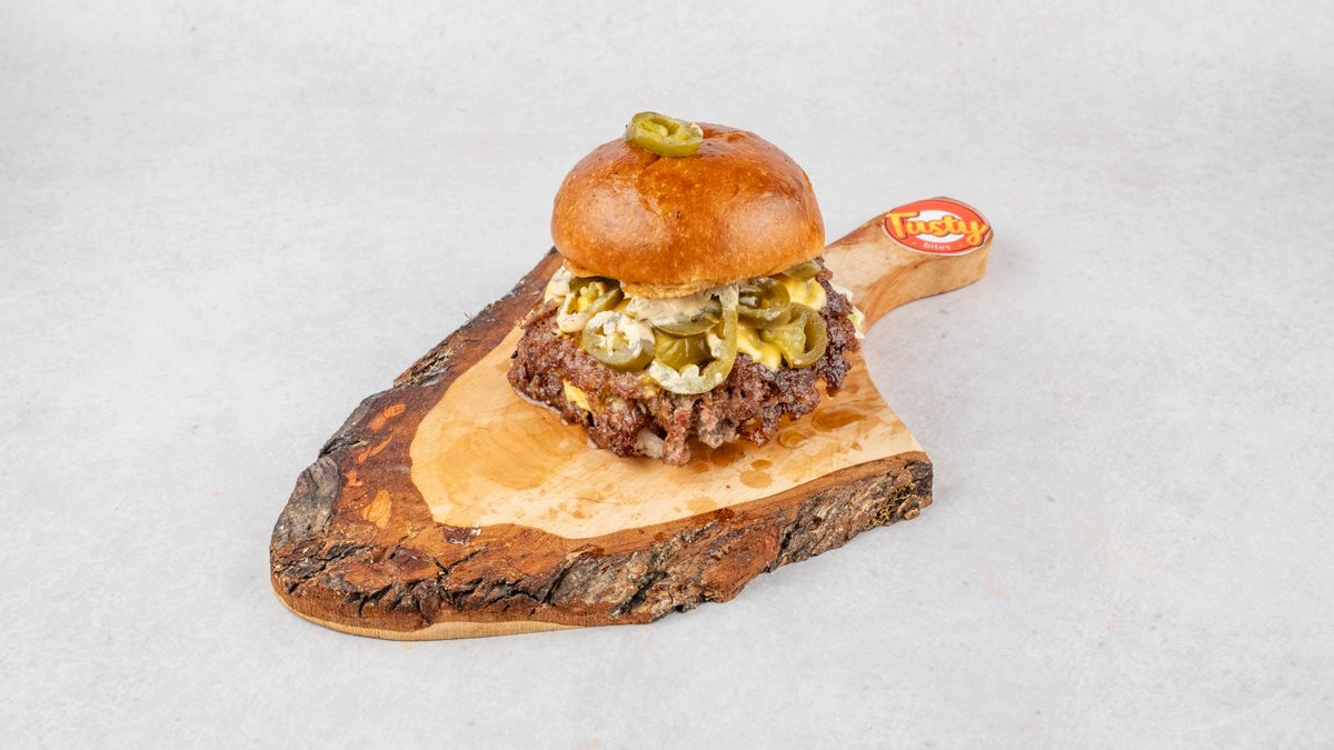 2x 100% juneći odrezak, američki sir, brioche pecivo, zelena salata, jalapeno papričice, ljuti Tasty umak, chili pahuljice
