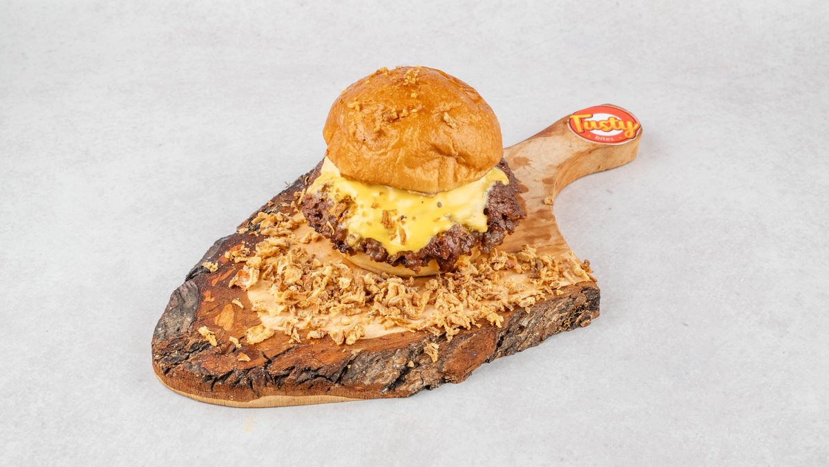 2x 100% juneći odrezak, američki sir, brioche pecivo, pečeni luk, Tasty umak