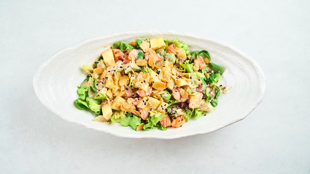 Miješana salata s lososom, avokadom, mangom, prženim bademima i sezamom u umaku po receptu chefa