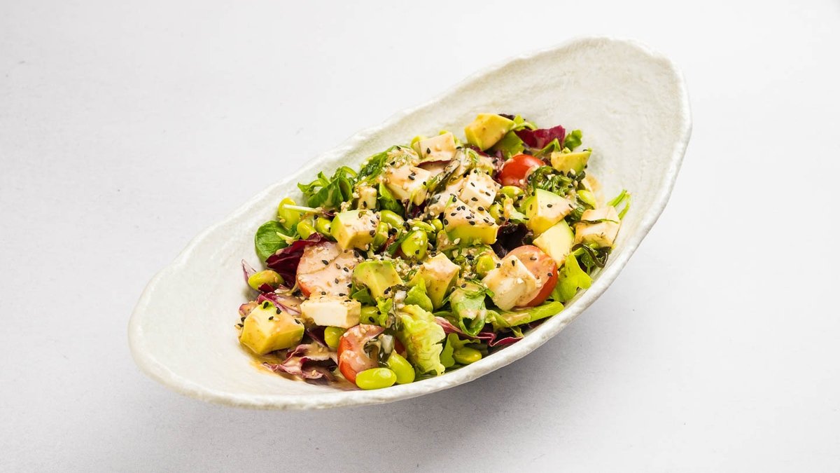 Miješana salata s tofuom, soyom, avokadom, cherry rajčicama, mariniranim algama i umakom od sezama