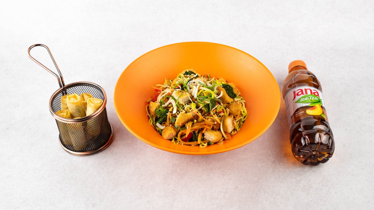Wheat/ rice noodles/riža po izboru, dimljeni tofu, tikvica, paprika, mrkva, brokula, poriluk, mladi luk, sezam, umak po izboru + prilog + sok