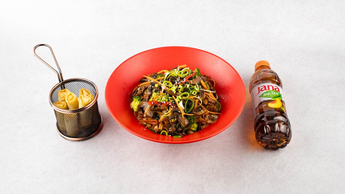 Wheat/ rice noodles/riža po izboru, shiitake gljive, bukovače, šampinjoni, tikvica, paprika, mrkva, brokula, poriluk, mladi luk,sezam, umak po izboru + prilog + sok