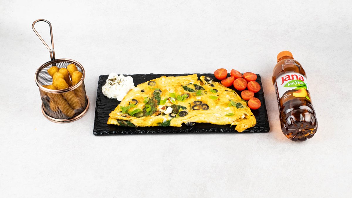 Početni omelette ide s 3 jaja, dodaci po izboru + prilog + sok