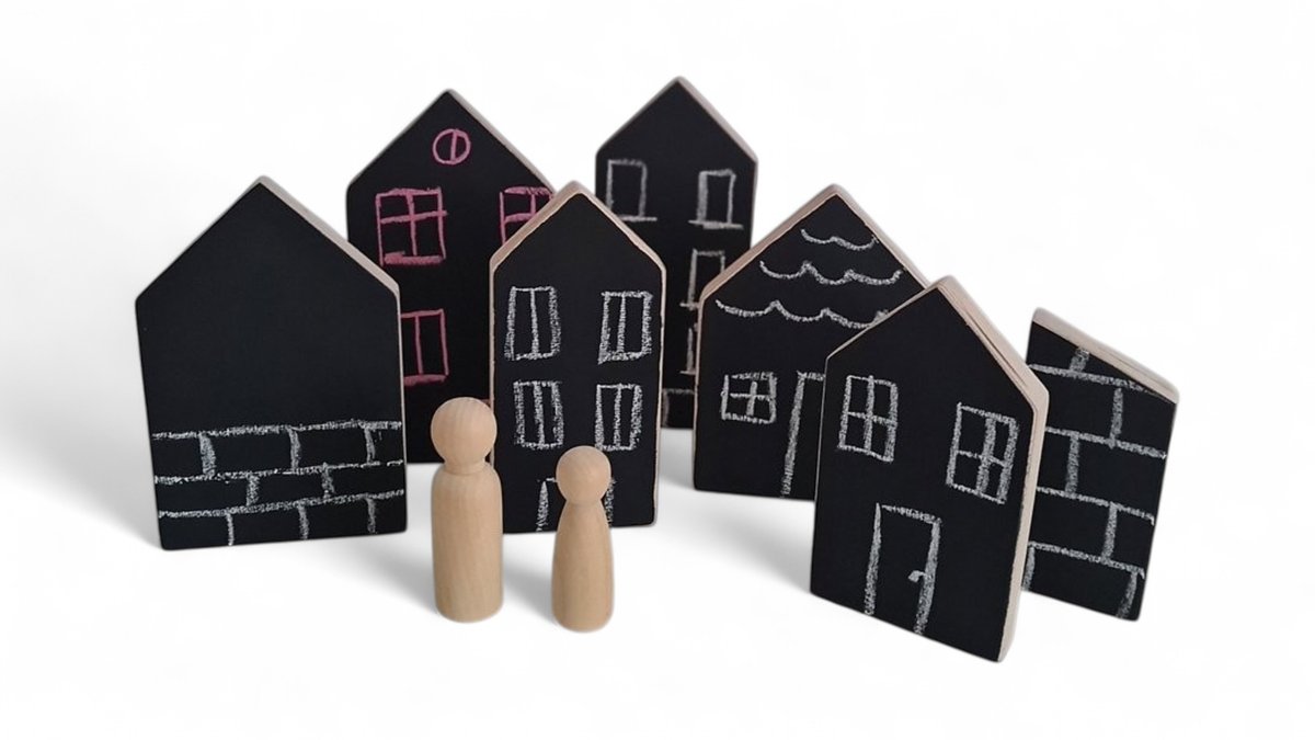 MY CITY/ set drvenih kućica za crtanje kredom + krede i drveni likovi