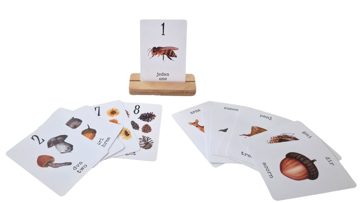 Flashcards HRV i ENG / Kartice dvojezične / Brojevi 1 do 10 + pojmovi iz šume + drveni stalak