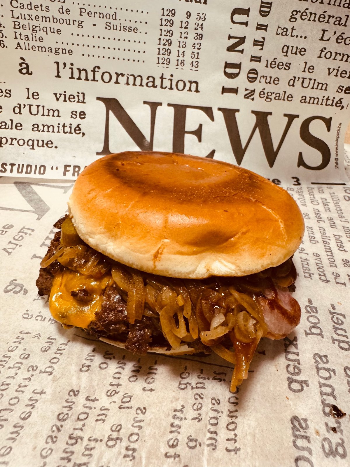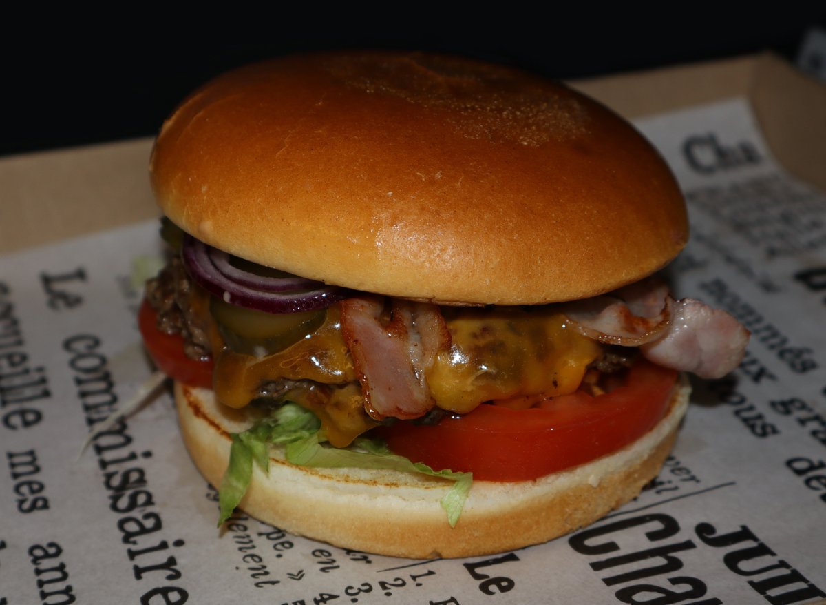 2x smash húspogácsa, cheddar, bacon, hagyma, paradicsom, saláta, savanyú ubi, burger szósz