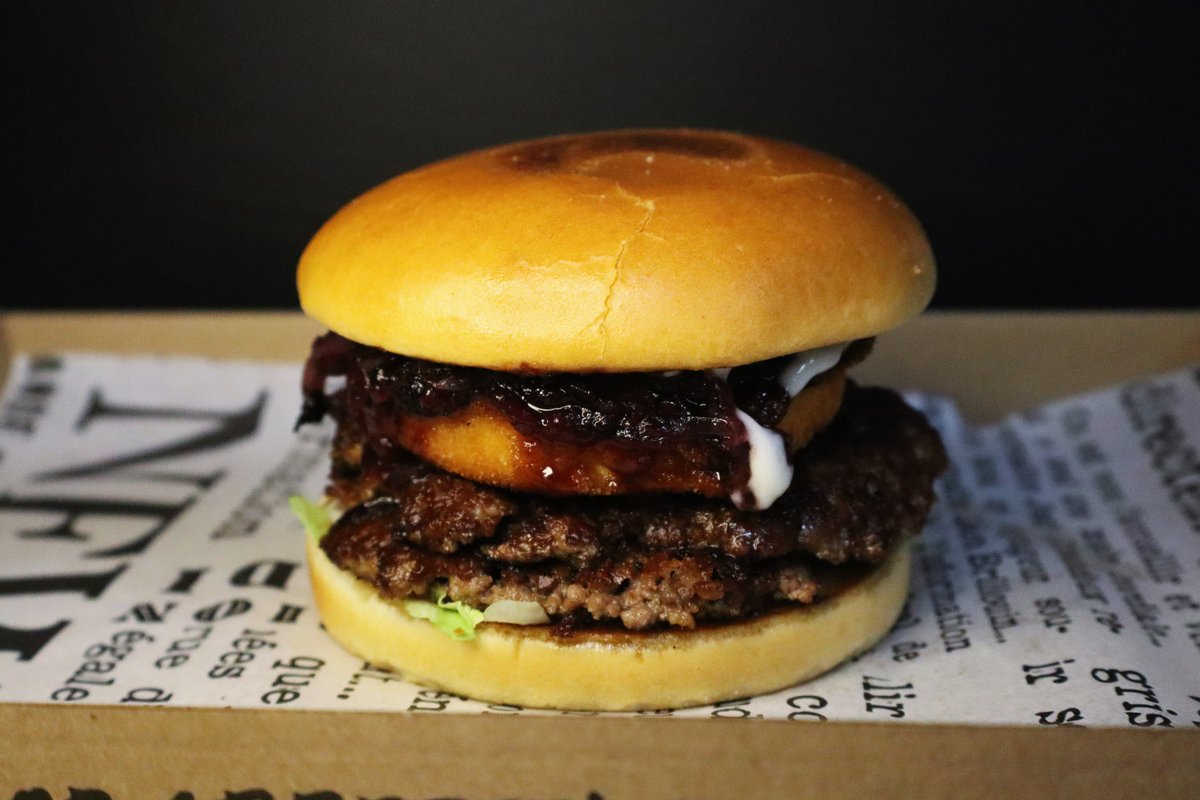 2x smash húspogácsa, rántott camembert, saláta, áfonyás lilahagymalekvár, majonéz