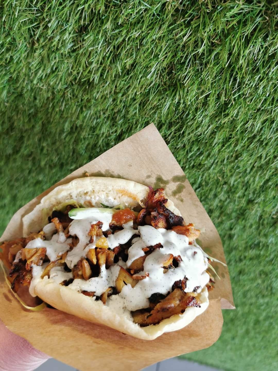 Gyros hús, friss zöldségek és joghurtos öntet pitában.