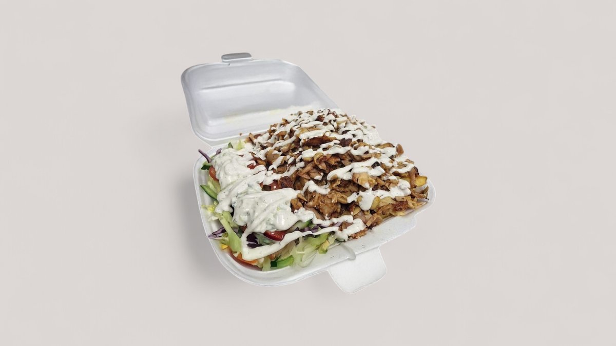 Gyros hús, hasábburgonya, friss zöldségek, tzatziki, csípős öntet, joghurtos öntet.