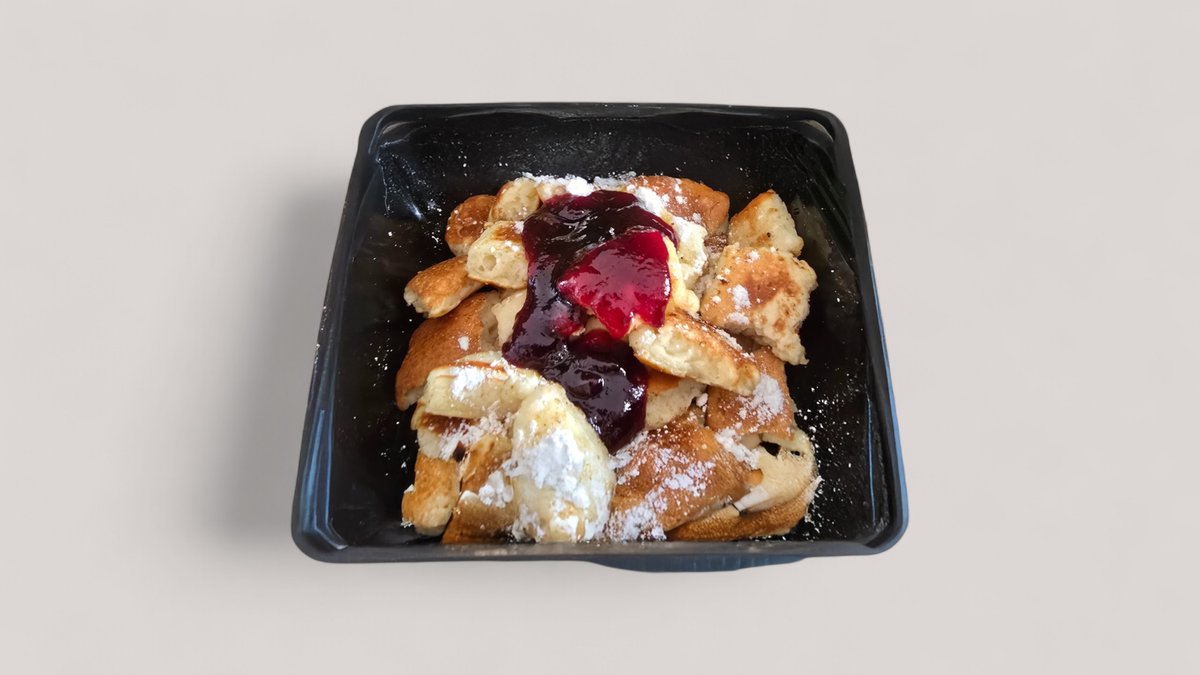 Burgonyás buci, bundázott csirkemell, grillezett camembert, áfonyás lilahagymalekvár, majonéz, jégsaláta