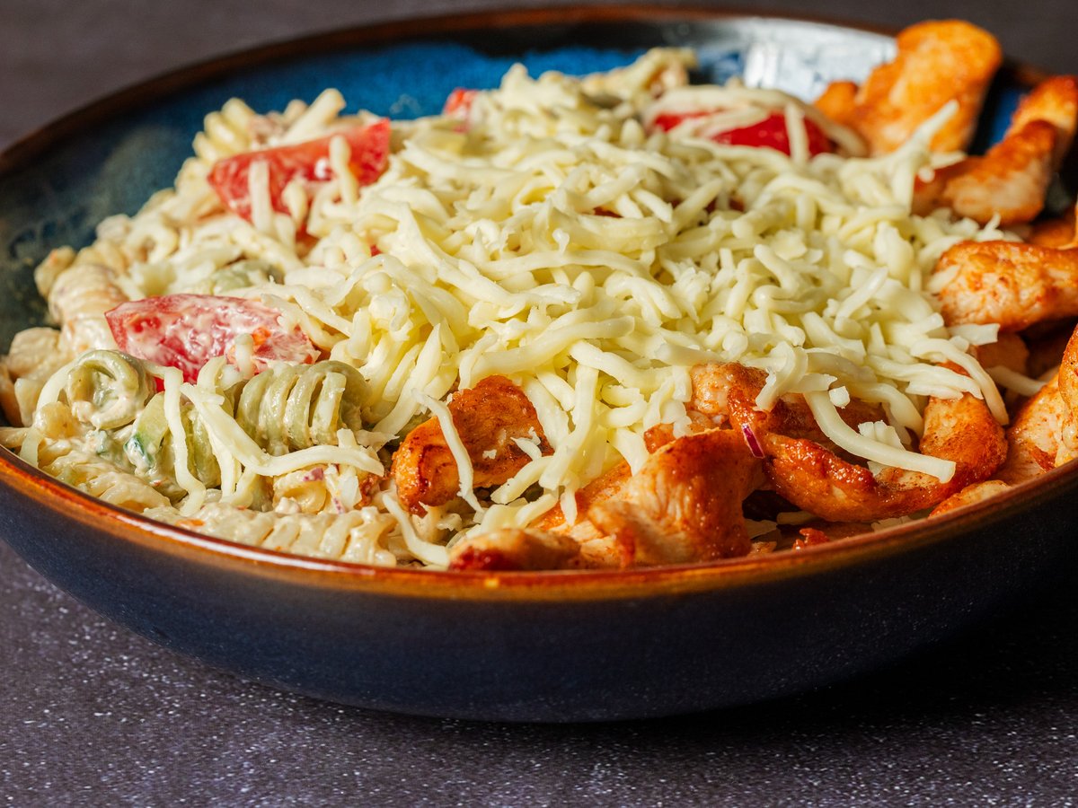 Tészta, mozzarella, aszalt paradicsom, pesto, zöldségek, grillezett csirkemell
