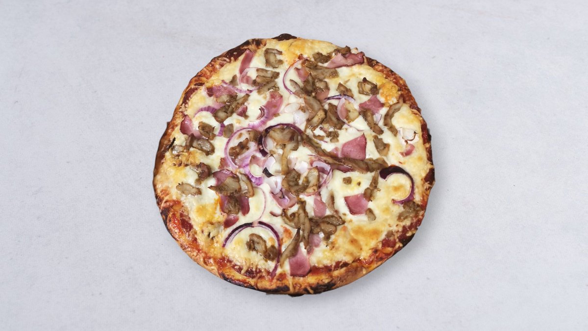 Fokhagymás tejfölös alap, mozzarella ,bacon, tarja csíkok, lila hagyma, kukorica, pici Jalapeno