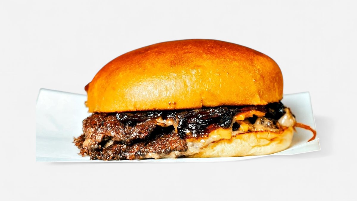 Piritott burgonyás buci, dupla smash marhahús, dupla american cheddar, gombakrém, hagymalekvár