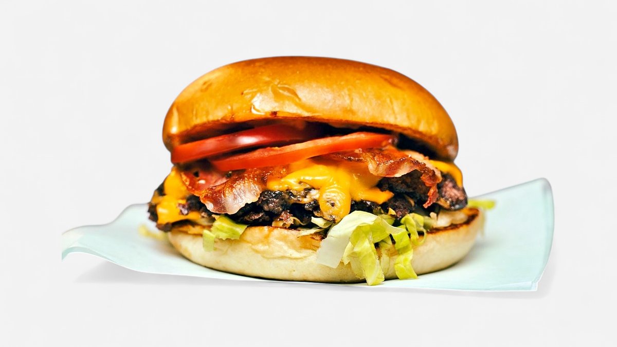 Piritott burgonyás buci, dupla smash marhahús, dupla american cheddar, bacon 2 szelet, római saláta, paradicsom, baconnaise szósz