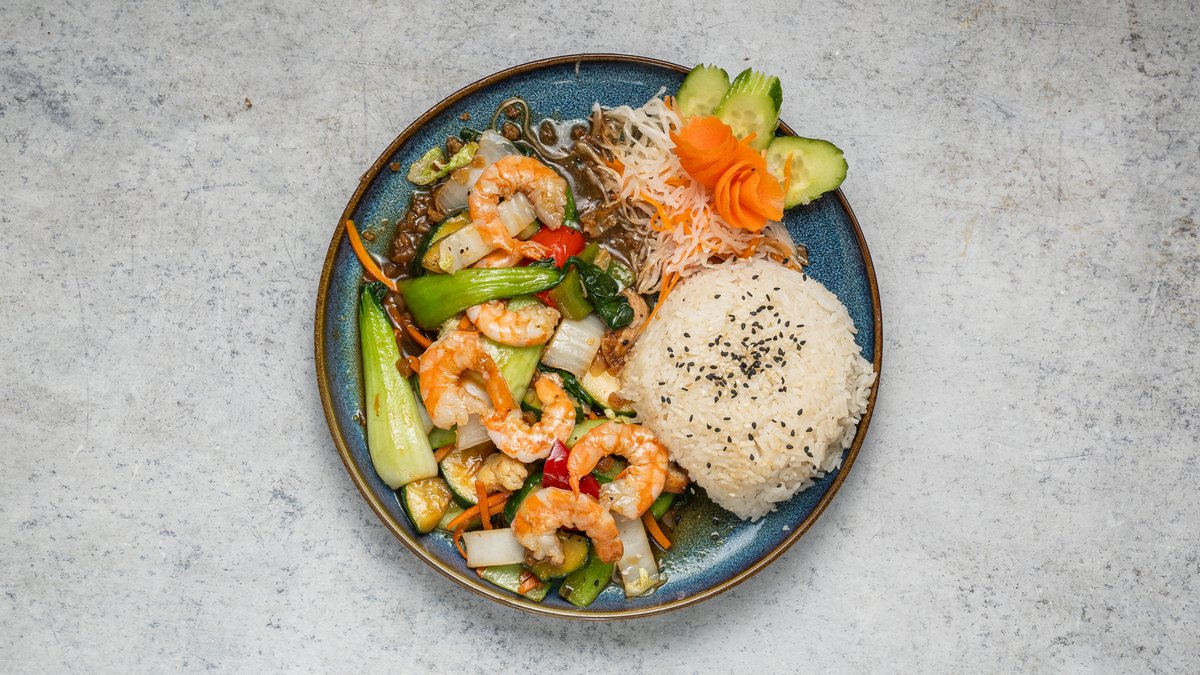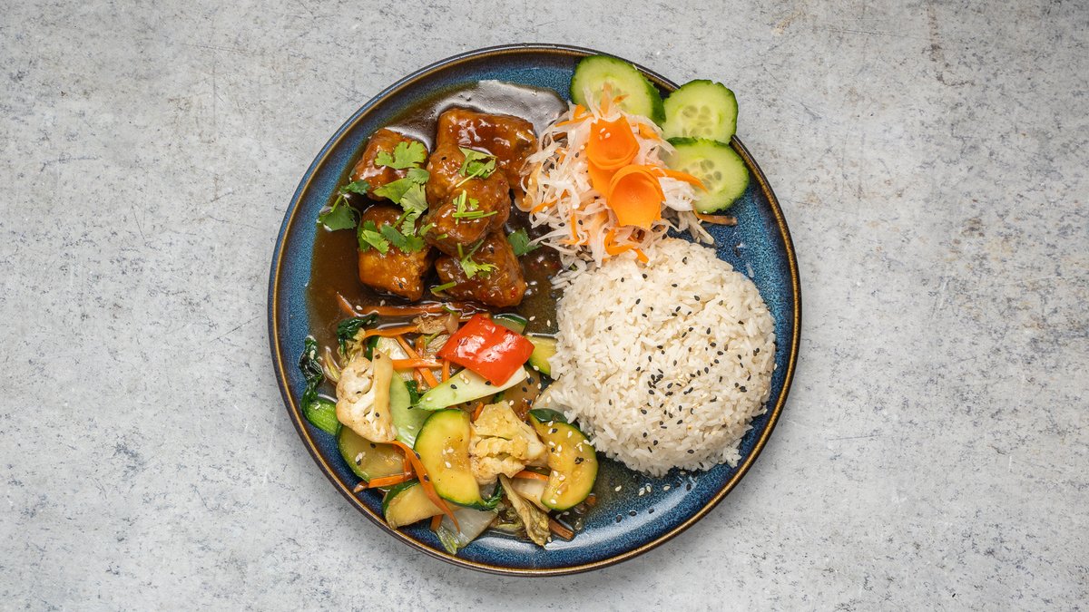Édes-savanyú oldalas rizzsel és zöldséggel