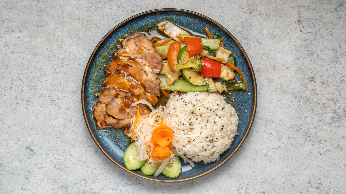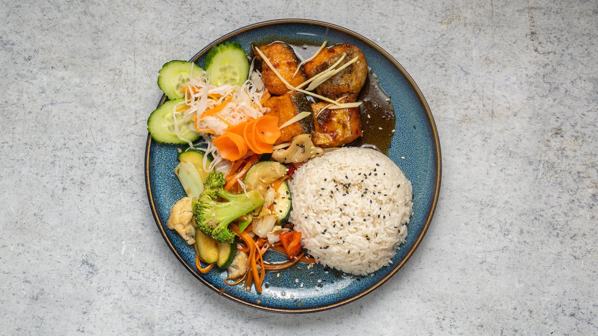 Sült lazac teriyaki szósszal rizzsel és zöldségekkel