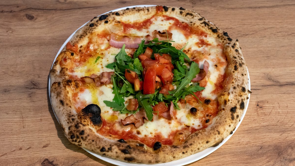 mozzarella fiori di latte, parmezán, koktélparadicsom, Pármai sonka, rukola, szarvasgomba olaj, bufala D.O.P