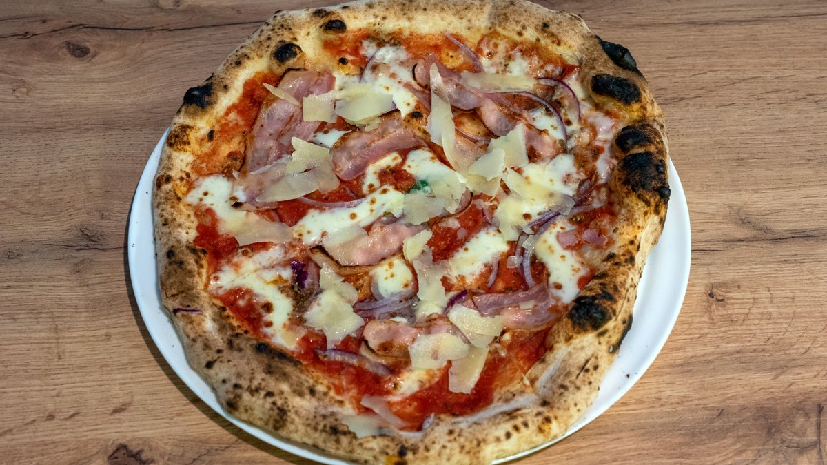paradicsom, fior di latte mozzarella, oregánó, bazsalikom, lilahagyma, pancetta, friss parmezán, extraszűz olívaolaj