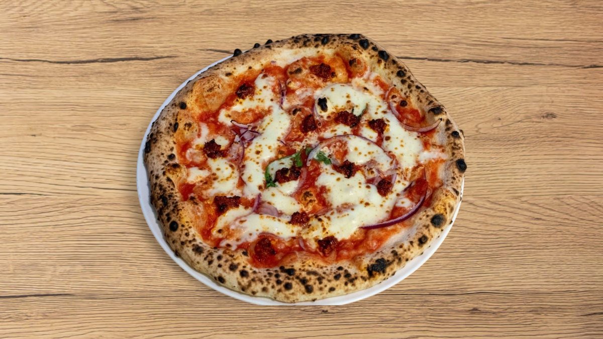 paradicsom, bazsalikom, mozzarella di bufala dop, füstölt provola ,lilahagyma, Nduja